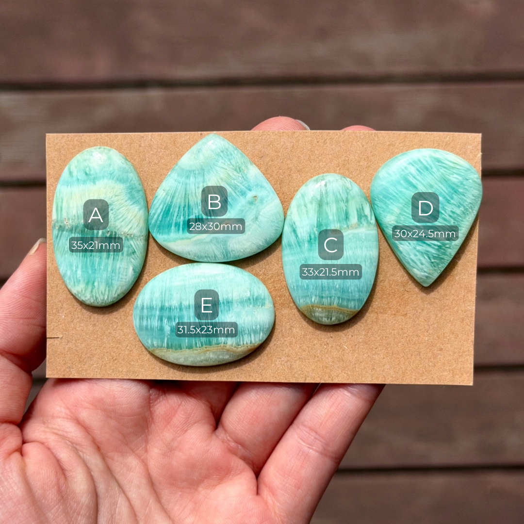 Fan-like patterns and soft tropical blues give these Blue Caribbean Calcite cabochons the look of ocean splashes frozen in time.